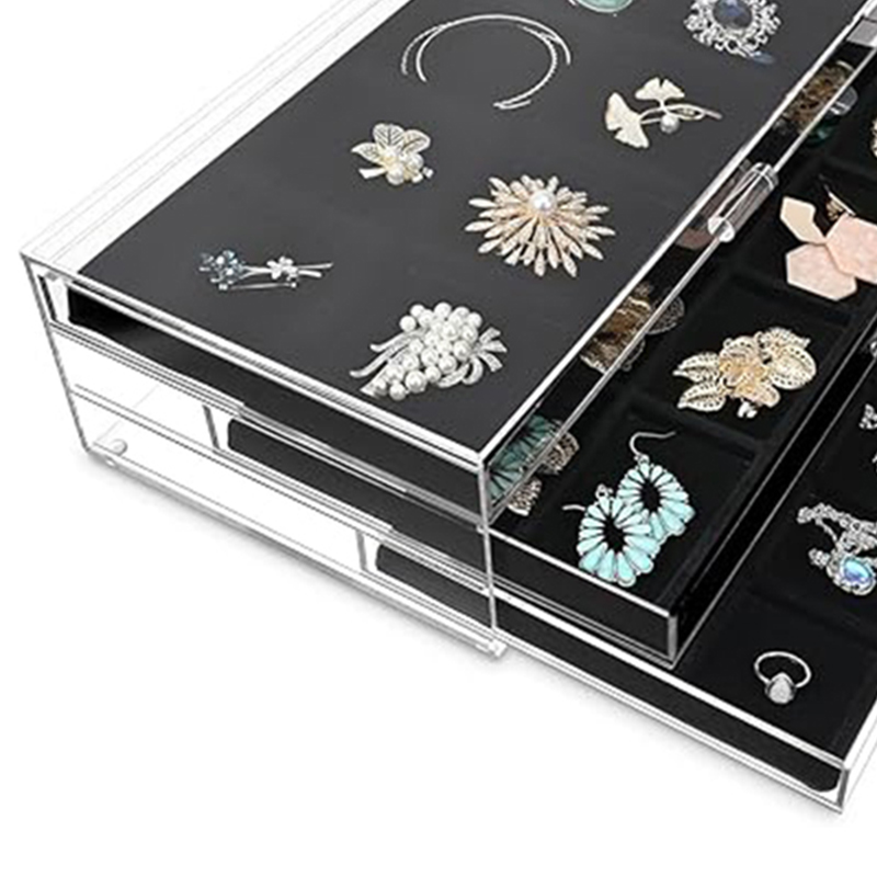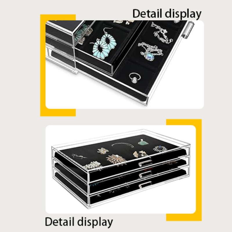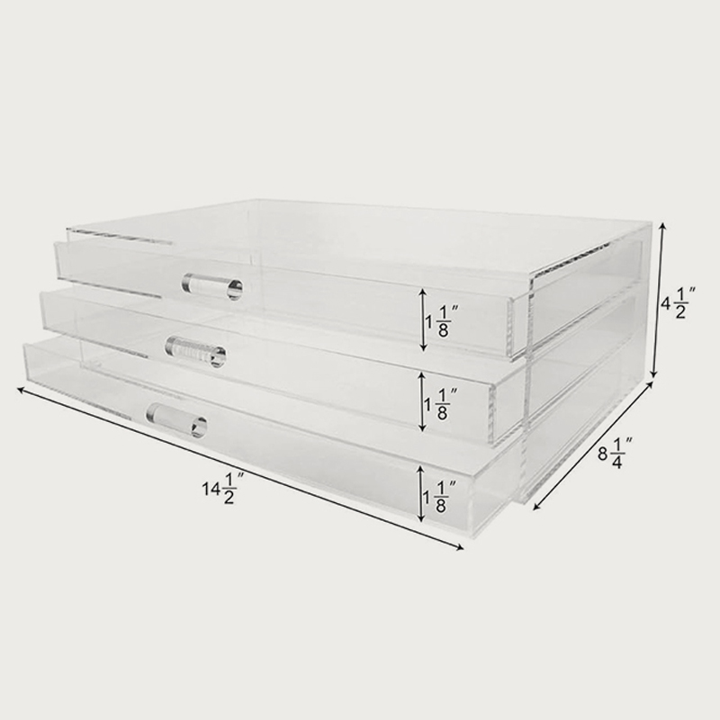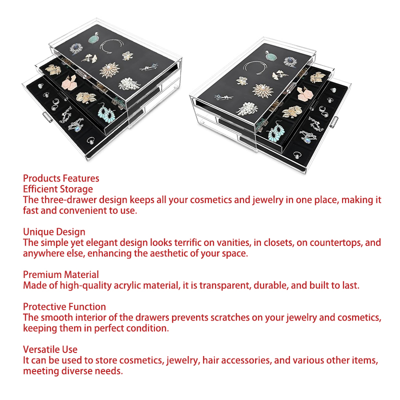 Ang premium na acrylic na three-drawer makeup organizer na ito ay gawa sa de-kalidad na materyal na acrylic, transparent at matibay. Ang simple ngunit eleganteng disenyo nito ay akmang-akma sa mga vanity, sa mga closet, sa mga countertop, at kahit saan pa, na nagpapaganda ng aesthetic ng iyong espasyo. Pinapanatili ng tatlong-drawer na disenyo ang lahat ng iyong mga kosmetiko at alahas sa isang lugar, na ginagawa itong mabilis at maginhawang gamitin. Ang makinis na loob ng mga drawer ay pumipigil sa mga gasgas sa iyong alahas at mga pampaganda, na pinapanatili ang mga ito sa perpektong kondisyon. Ginagamit man bilang pang-araw-araw na tool sa pag-iimbak o bilang regalo para sa mga kaibigan at pamilya, ang organizer na ito ay isang mahusay na pagpipilian.