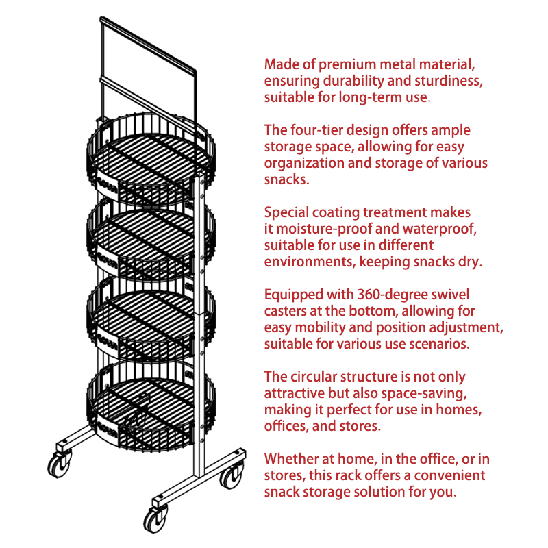 Ang 4-Tier Mobile Snack Rack ay gawa sa mataas na kalidad na metal, na idinisenyo para sa tibay at pangmatagalang pagiging maaasahan. Ang apat na layer na malaking kapasidad na disenyo nito ay nagbibigay ng sapat na espasyo sa pag-iimbak, na nagbibigay-daan sa madaling pag-aayos at pag-imbak ng iba't ibang meryenda, na ginagawa itong perpekto para sa mga kusina sa bahay, mga silid ng pahinga sa opisina, at mga tindahan ng meryenda. Tinitiyak ng espesyal na moisture-proof at waterproof coating treatment na mananatiling tuyo ang mga meryenda sa iba't ibang kapaligiran. Nilagyan ng 360-degree swivel casters sa ibaba, ito ay flexible at madaling ilipat, na nagpapahintulot sa mga pagsasaayos ng posisyon upang matugunan ang iba't ibang mga pangangailangan. Ang pabilog na istraktura ay hindi lamang aesthetically kasiya-siya ngunit din space-saving, ginagawa itong isang mahusay na solusyon sa pag-iimbak ng meryenda na pinagsasama ang kagandahan at pagiging praktiko.