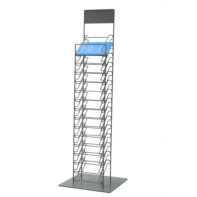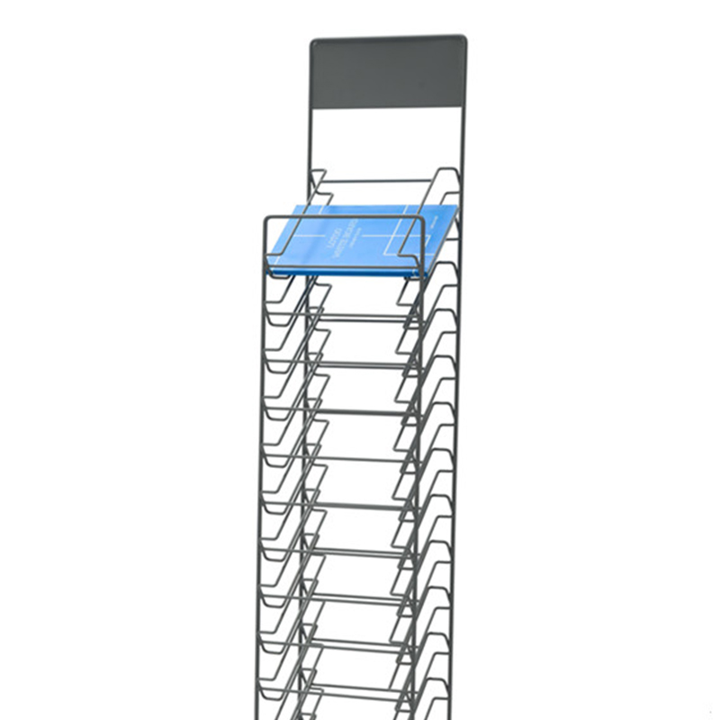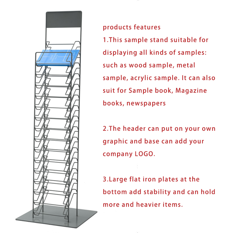 Ang Tile Sample Display Rack na ito ay naglalapat ng matibay na cold-rolled na bakal na may makinis na gray na powder-coat na finish, na tinitiyak ang paglaban sa kalawang at pangmatagalang buhay ng serbisyo kahit na sa ilalim ng mabigat na pang-araw-araw na paggamit. Ang bukas na vertical panel nito ay nagbibigay-daan sa mga sample na mailagay at maalis nang walang kahirap-hirap, habang pinapabuti ng angled support system ang visibility at accessibility ng produkto. Ang nangungunang header ay idinisenyo para sa nako-customize na mga graphics at brand messaging, at ang base ay nagbibigay ng isang nakatuong lugar upang magdagdag ng logo ng kumpanya, na nagpapahusay sa pagkilala sa brand. Maging ito ay mga sample ng kahoy, mga sample ng acrylic, mga sample ng ceramic, mga sample na libro, o mga magazine, ang maraming nalalaman na frame na ito ay gumaganap din nang perpekto bilang isang Magazine Display Stand.