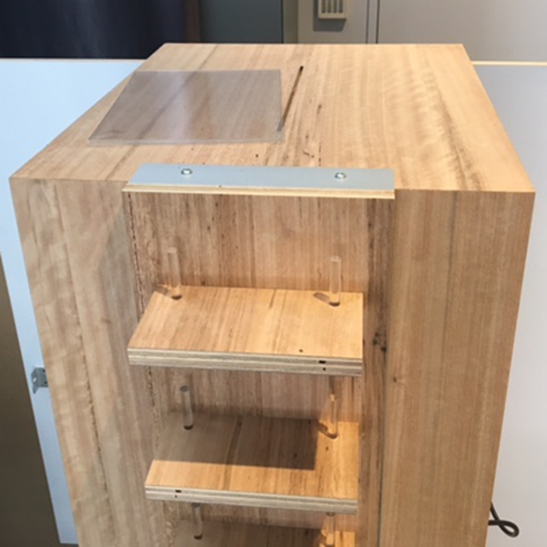 Wood cabinet na may matibay, mataas na kalidad na mga istante ng acrylic.