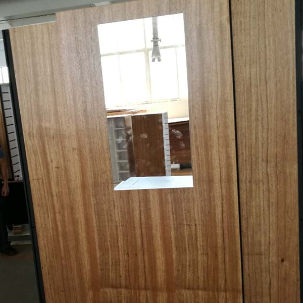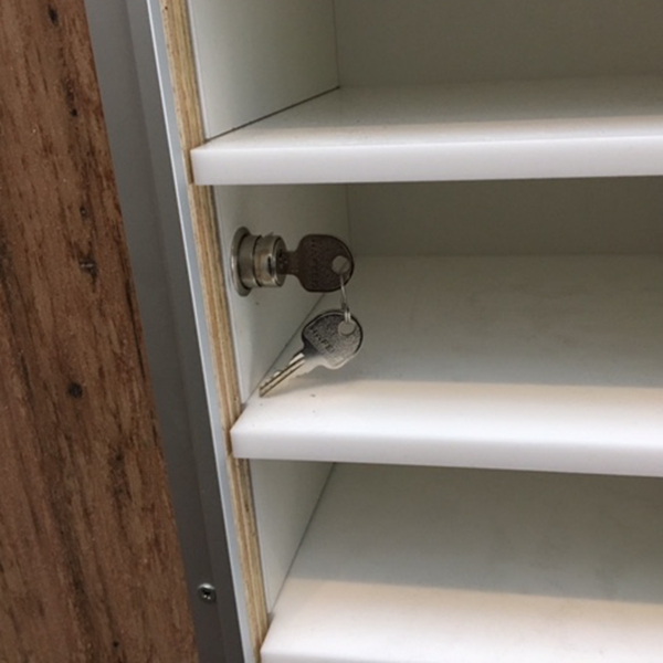 Naka-lock na pinto sa kaliwang bahagi ng cabinet na gawa sa kahoy na may U-channel para sa paglalagay ng mga logo o signage.