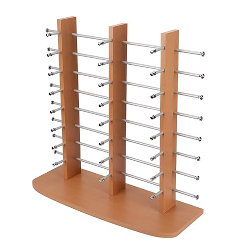 Itong tabletop eyewear display rack ay idinisenyo upang mag-alok ng pinakamahusay na solusyon sa display para sa mga retail na tindahan, boutique, at personal na kolektor. Ang mataas na kalidad na kahoy at matatag na istraktura ay gumagawa ng display stand na parehong functional at aesthetically kasiya-siya. Ang single-tier na disenyo ay maaaring maglaman ng 6, 12, o 24 na pares ng salamin, na nakakatipid ng espasyo at nagpapadali sa organisasyon. Ito ay angkop para sa pagpapakita ng iba't ibang uri ng eyewear, kabilang ang mga salaming pang-araw at salamin sa pagbabasa. Pinipigilan ng matatag na base ang pagbagsak, at ang simple ngunit eleganteng hitsura ay nagpapaganda sa pagpapakita ng iyong mga produkto. Perpekto para sa paggamit sa mga retail na tindahan, exhibition booth, personal collector room, at home decoration, na nagpapatingkad sa display ng iyong produkto.