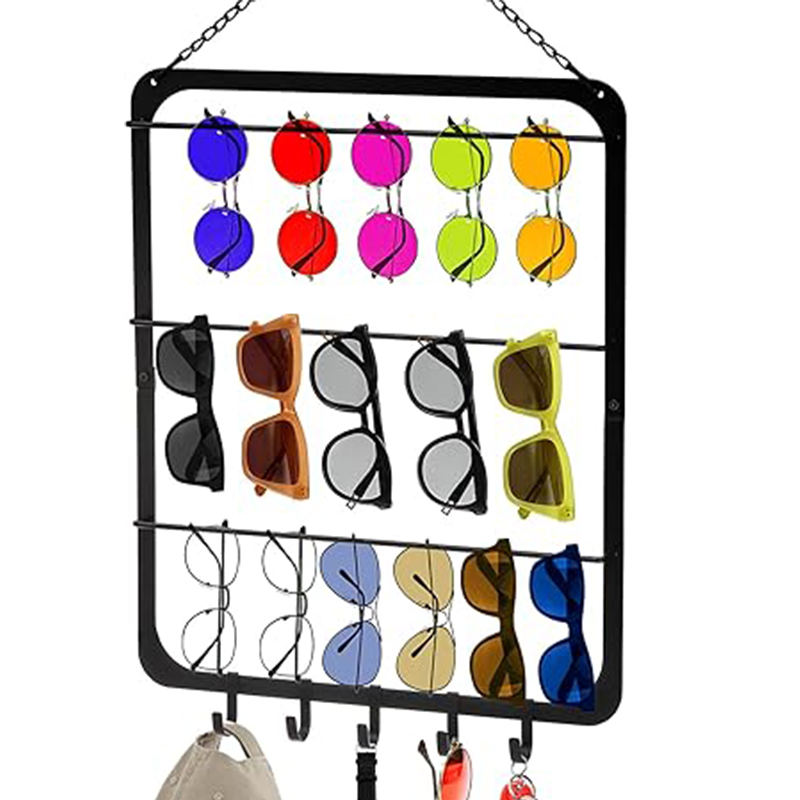 3-Tier na Disenyo para sa Mahusay na Imbakan:3-Tier na Rack ng Imbakan ng Salamin, Ang bawat baitang ay may hawak na 8 pares ng salamin, na may karagdagang 5 naaalis na kawit para sa pag-imbak ng hanggang 29 na pares ng salaming pang-araw o iba pang mga accessory tulad ng mga headphone, sumbrero, at relo, na lubos na nagpapahusay sa paggamit ng espasyo.